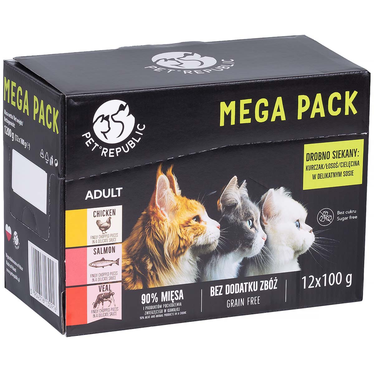 PetRepublic wet cat food is a unique food containing 90% meat. Cat food is valuable in many vitamins and minerals that are valuable for the body of a small pet, ensuring its health and beautiful appearance. The form of the sachets ensures that the food is always fresh, which is then eagerly eaten by the cats. A mix of cat food flavors will provide variety in your diet, and the food will certainly not get boring quickly.