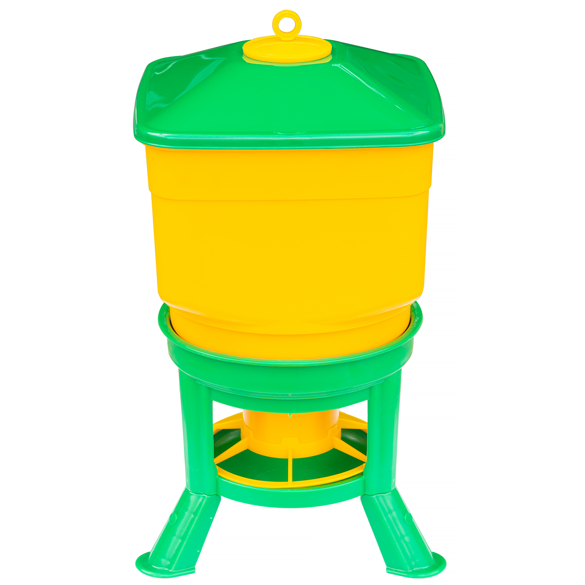 High quality feed machine with a 30 kg hopper dedicated to various poultry species: chickens, broilers, pheasants, ducks. The feeder for poultry is made entirely of strong and durable plastic, resistant to weather conditions. The laying feeder stands on three solid legs, which makes it stable and resistant to shocks. The poultry feeder has a lockable hinged lid, thanks to which the feed is protected against moisture or dirt. In addition, in the flap there is a crescent-shaped inspection window, through which the breeder can quickly check the amount of food left for the birds.The feed is filled automatically (as the birds eat) into the bottom bowl, from which the hens can take it. A protective grille is applied to the bowl, which protects against spillage and wasting feed by poultry.The offer also includes tank drinker with a capacity of 50 l for poultry.