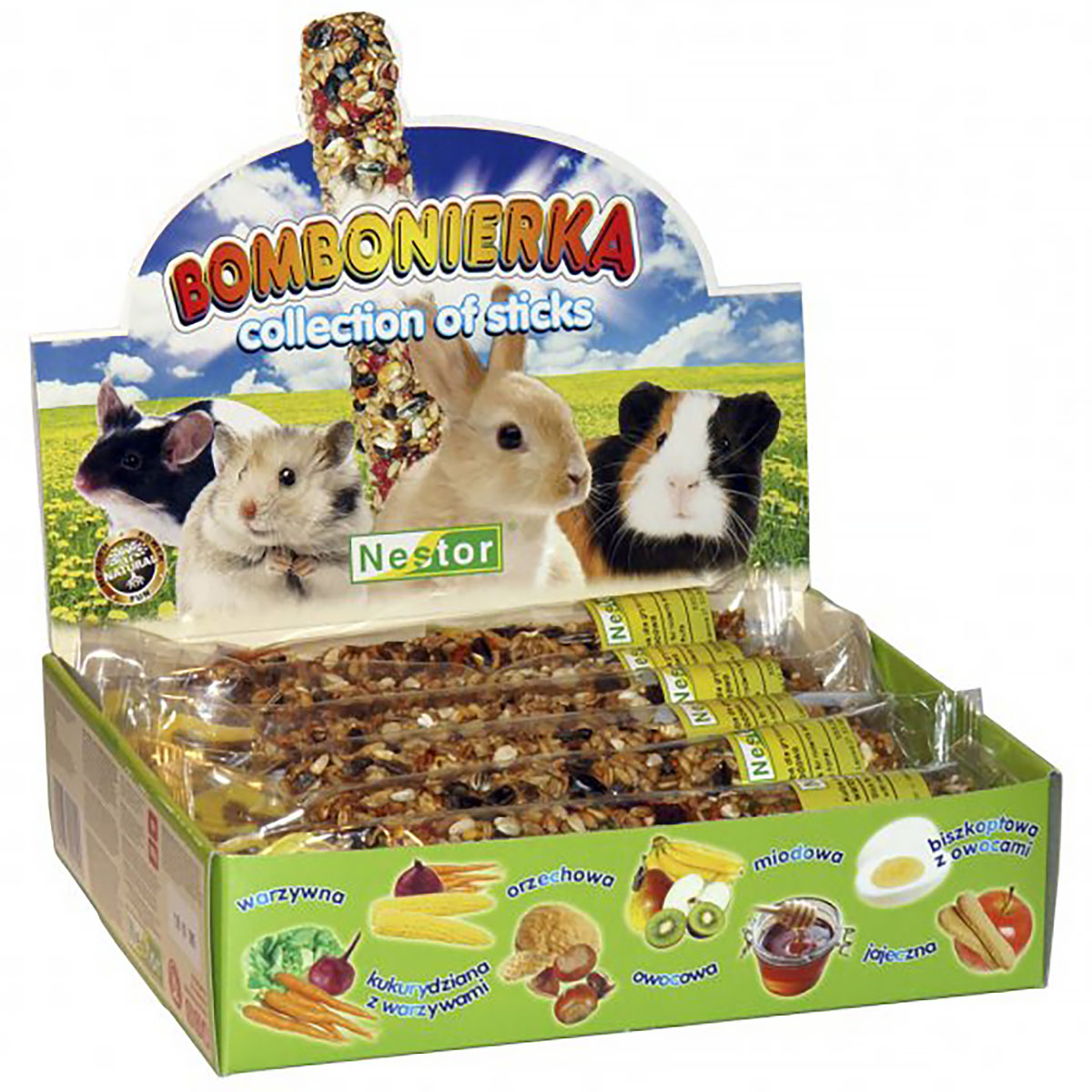 A box of chocolates for rabbits and rodents, which contains delicacies in the form of cereal cobs. They are perfect for hamsters, domestic cavies, rats, mice, degus and other small rodents. The set contains 12 cobs in 7 different flavors:
