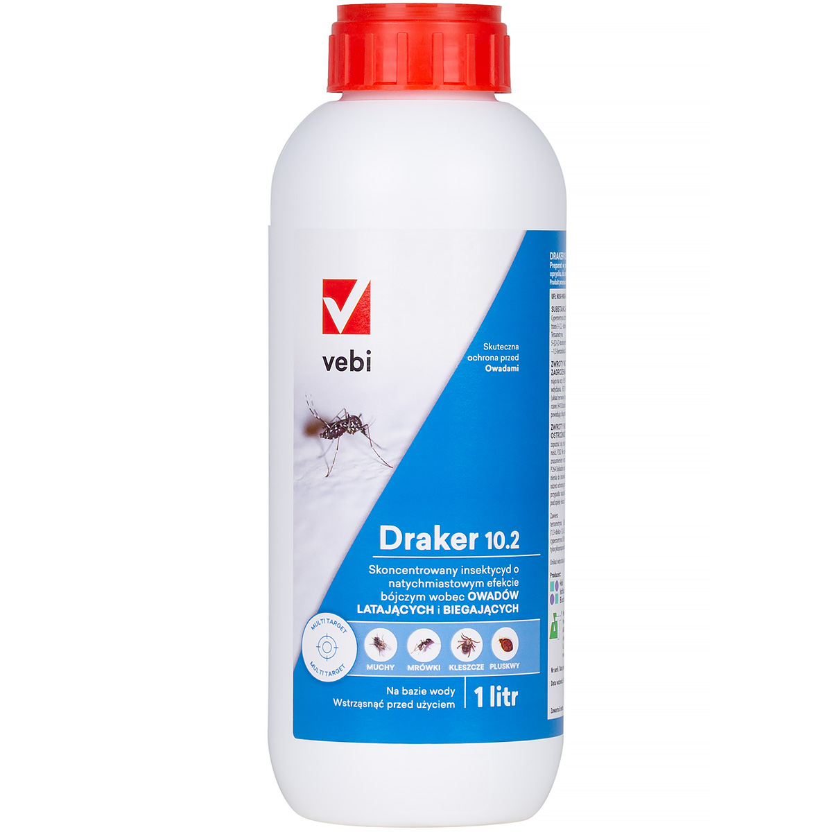 High effective insecticide in a package of 1000 ml. The agent is in the form of a concentrate and is designed to prepare a solution of 0.5 -3 %, making it very efficient and sufficient for large areas. The draker preparation perfectly copes with all insects. It fights flying insects, i.e. flies, mosquitoes, wasps, as well as walking insects, i.e. ants, ticks, bedbugs or cockroaches. Due to its high efficiency, the agent can be used in livestock buildings, public transport, food industry, halls, warehouses, apartments and other places where there are nuisance insects. The preparation for controling resistant insects is a mixture of three substances: cypermethrin, tetramethrin and piperonyl butoxide. The composition of the insecticide makes it effective in controling very bothersome insects. The insect after contact with spraying perishes instantly. Directions for use:Apply the preparation using sprayers.The preparation can be used outdoors by creating a barrier around buildings, around windows, on window sills in places of garbage disposal.Inside buildings, it can be applied at skirting boards, around the room, in corners, in nooks and crannies, in places of garbage accumulation, places of landing, resting and passage of insects.dosage: