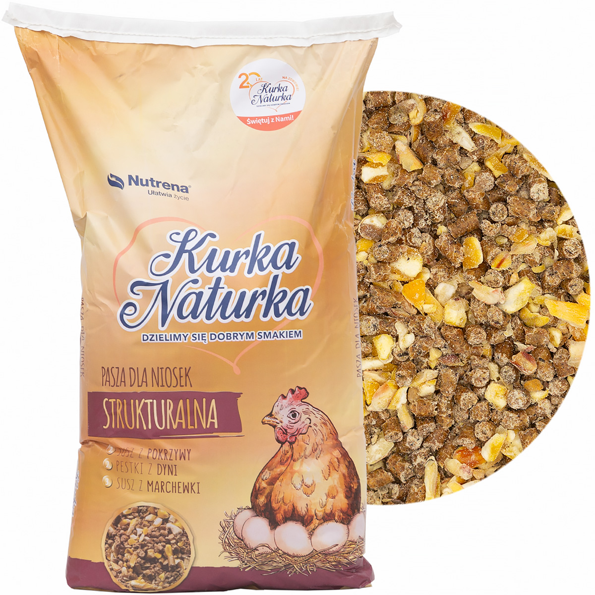 Feed for laying hens 25 kg in granules with corn grains. Due to its attractive form, the feed of the naturka chanterelle is very willingly eaten by birds.