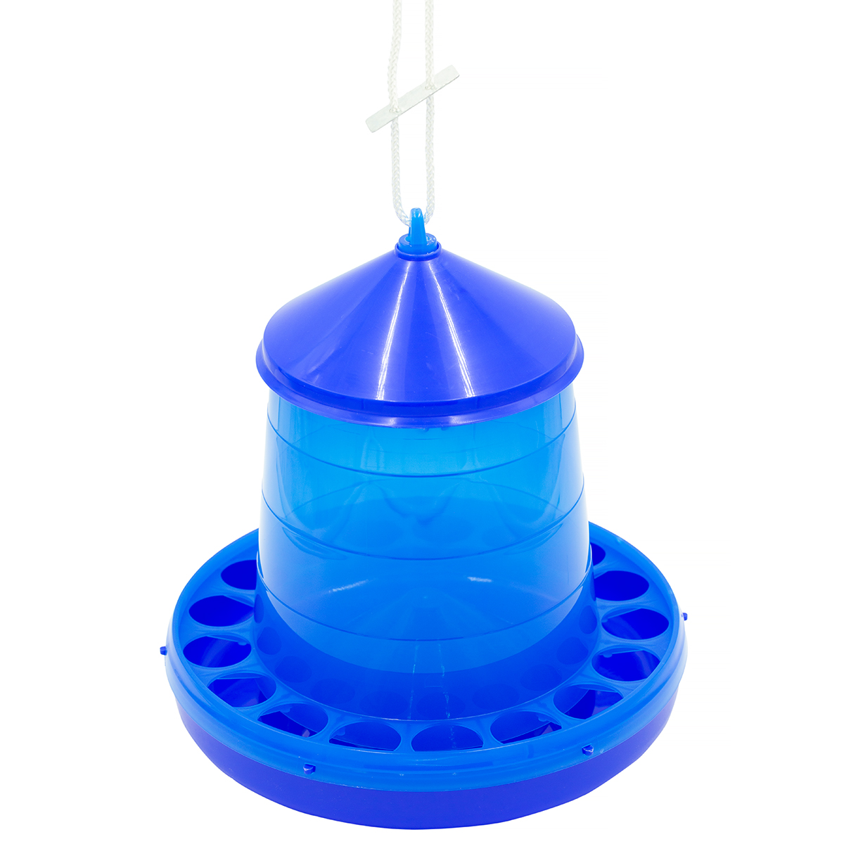 Fowry feeder with a transparent 4 kg hopper. The feeder is perfect for home poultry farms. It can be used in chicken coops and aviaries or paddocks. Feeder for chickens is very convenient and functional in use. It has a special design that makes it easier for the breeder to dispense feed. The feeder tank for poultry is transparent, so you can visually assess how much feed is left inside and when it needs to be replenished. The feeder in the lower bowl has holes that separate the feed collection stations, but also prevent it from spilling and soiling. Birds do not have the opportunity to enter the interior of the trough, so that the feed remains clean. The feeder for layers was built on the principle of a cone, thanks to which the feed freely falls into the lower bowl. The feed does not clump on the side walls, so it remains fresh for a long time. The tank for chicken feed in the set has a string for hanging and a slide for height adjustment. You can hang them in a chicken coop or aviary, as well as put on the surface. Due to the possibility of hanging, the feeder can be used both for rearing and subsequent fattening. The whole is made of the highest quality materials, thanks to which it is durable and resistant to difficult weather conditions. What distinguishes the feeder is also the blue color, which looks very nice in the aviary.