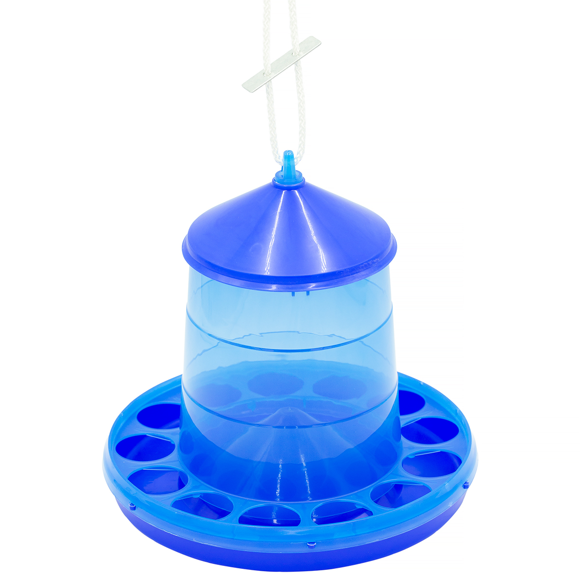 Neptune poultry feed with a hopper capacity of 2 kg. This model of the feeder was designed for small home farms and dosing feed for the smallest birds, i.e. chickens, quails. Feeder for chickens is very functional and convenient to use. What distinguishes them from other feeders is a transparent hopper, thanks to which the breeder can see how much feed is left inside. The feeder is conveniently backfilled from above, and the cone-shaped hopper prevents the feed from clumping, which remains fresh for a long time. In the feeder bowl there are holes that separate the feed collection stations, thereby preventing it from spilling. Birds do not have the opportunity to sit inside the trough, thanks to which it remains clean. The feeder for chickens has a stable connection of the tray with the lower bowl. They can be placed on the ground or thanks to the hole to hang. The set includes a cord to hang the feeder and a slider for height adjustment. Transparent feeder for chickens is made of the highest quality materials. It is characterized by high strength and resistance to difficult weather conditions, thanks to which it can be used both indoors and outdoors.