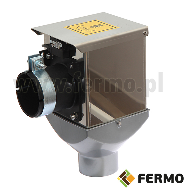 The presented control unit with flap sensor and safety sensor is designed for a 90 mm pipe for the feeder in feeding systems. It is mounted mainly at the end of the transverse line for feeding pigs and poultry: laying hens, ducks, broilers or turkeys.