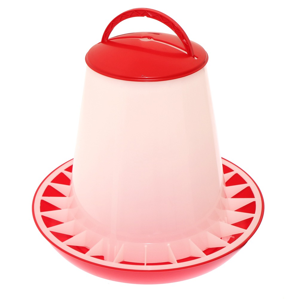 Solid feeder for poultry with a capacity of up to 10kg of feed. The feeder is made of strong plastic resistant to impact or cracking. It is specially prepared for feeding to laying hens or broilers.