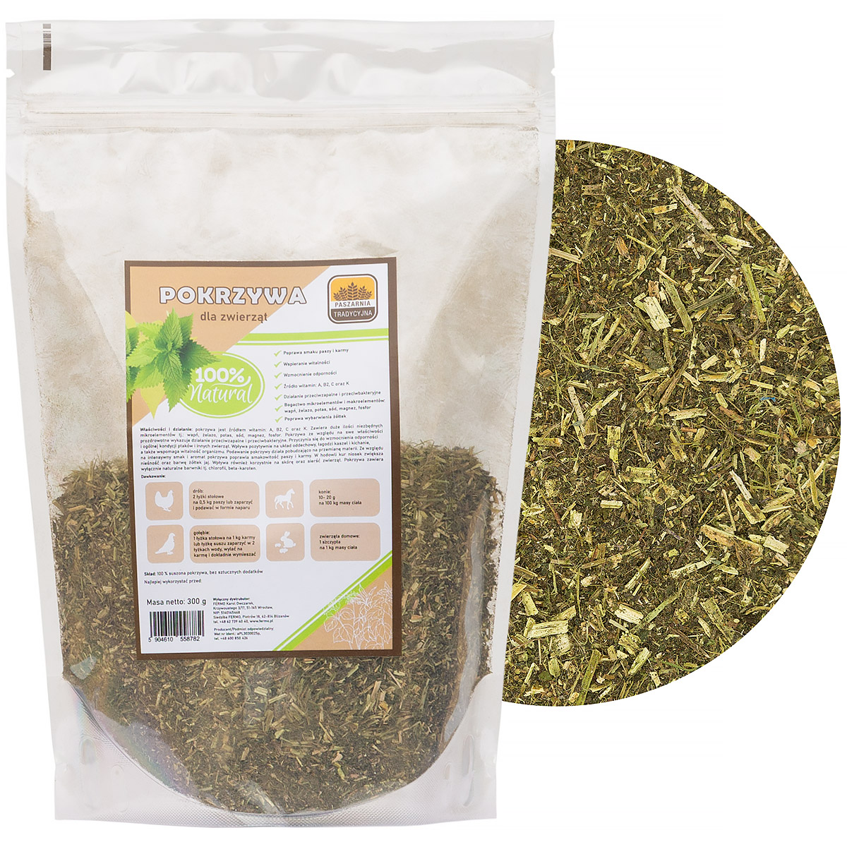 Dried nettle is a natural feed additive for poultry, pigeons, rabbits or horses. Giving nettle to hens or other animals with feed has a very positive effect on their health due to the wealth of vitamins contained in nettle. Nettle soothes coughing and sneezing, improves the palatability of feed, and in the case of laying hens - increases egg production and improves the color of egg yolks.