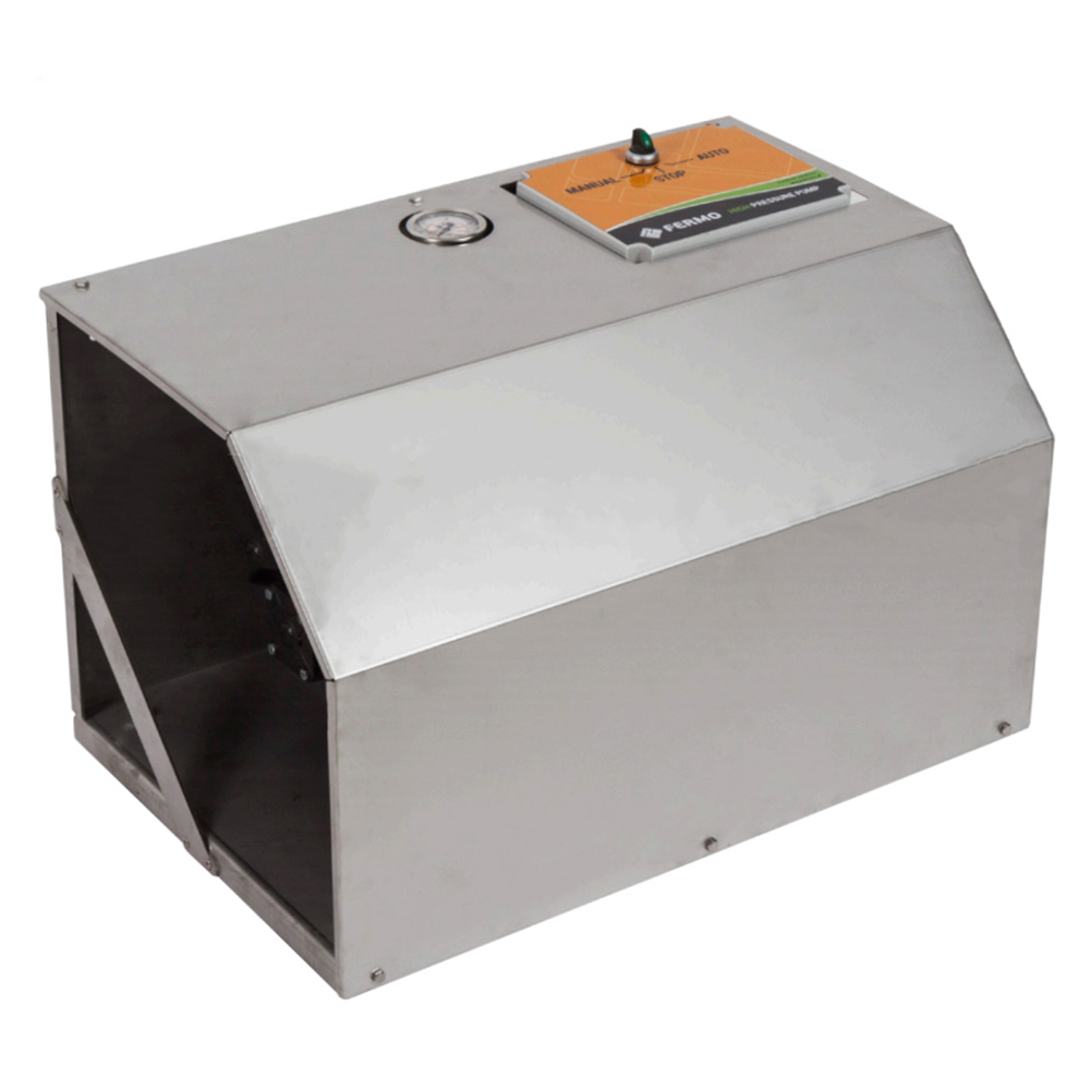 The mechanism of the FERMO fogging pump is enclosed in a solid housing, made of stainless steel, extremely resistant to difficult conditions prevailing in livestock buildings and mechanical damage. There is also a built-in accurate pressure gauge on the housing, informing the user about the pump pressure at the moment. A solenoid valve with a coil is responsible for the flow of water to the sprinkler pipes. The FERMO high-pressure pump is powered from a three-phase network (400 V).