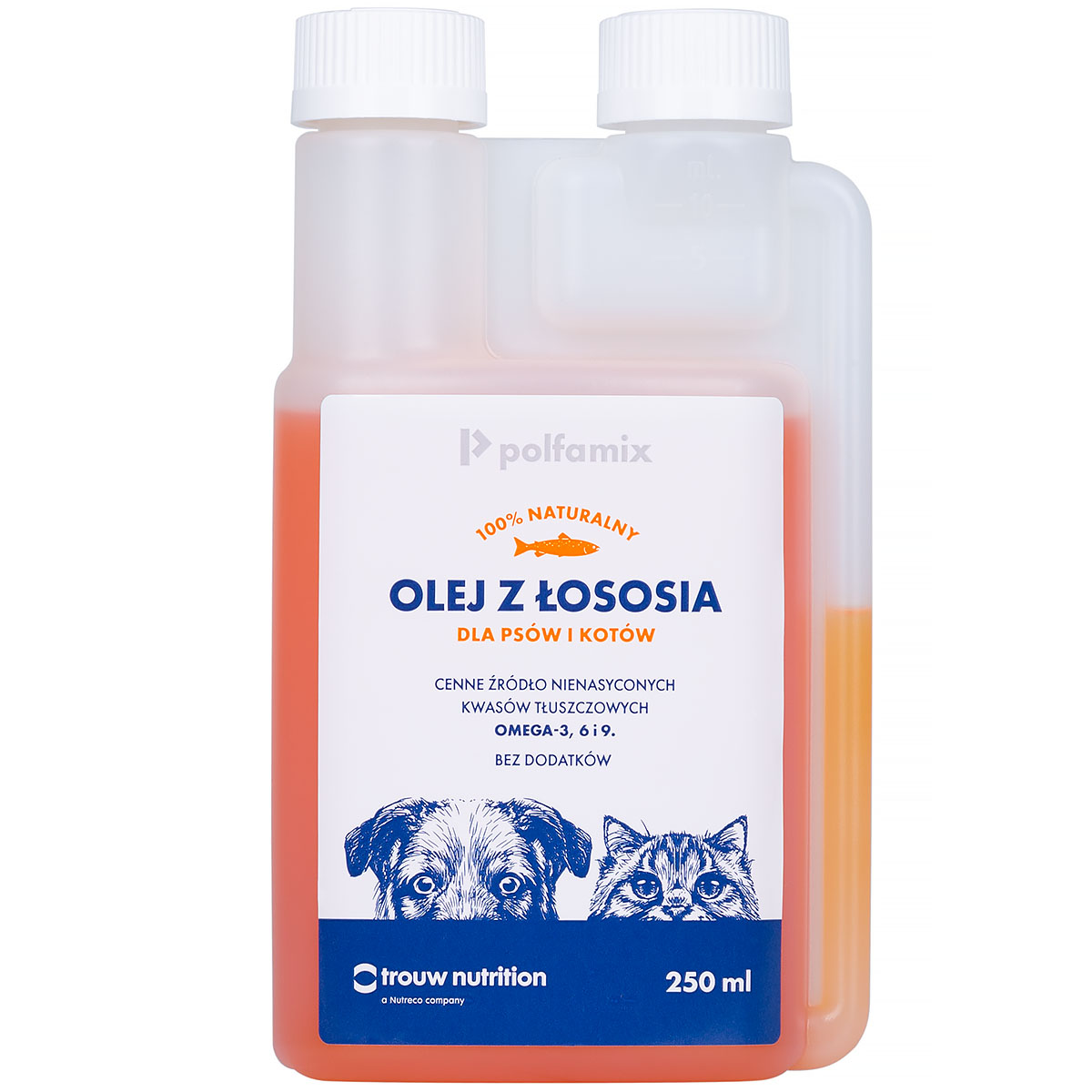 Polfamix salmon oil for dogs and cats with a capacity of 250 ml is a product of natural origin, which is a source of unsaturated fatty acids, including Omega-3, 6 and 9. Salmon oil for dogs is extracted from fresh and unprocessed fish. Salmon oil for dogs has a beneficial effect on the functioning of the entire body of animals and can be a supplement in the diet of dogs and cats of all breeds, regardless of their age. Its use in the diet of dogs and cats makes the food more attractive and improves the overall condition of animals.