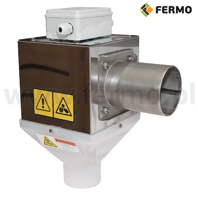 High quality control unit used in automatic poultry feeding systems. The unit is mounted at the end of the transverse line above the last feed basket. The offered unit is dedicated to the transverse line with a pipe fi 56 mm.The body of the unit and the output to the rura are made of stainless steel. In the lower part there is a ABS plastic drain hopper to which the telescopic tube is mounted. In the rear part of the unit body is connected motoreducer. The FERMO Inox-Line PLUS control unit has a built-in membrane sensor. Attention! there is no proximity sensor in the set, you can buy it separately! The offer also includes FERMO control units for other pipe sizes.