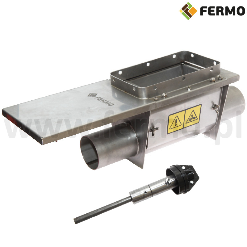 Complete through yoke for stainless steel silo included with gate valve and shaft for fixing the spiral. The stainless steel yoke under the silo is designed for PVC pipes fi 90 mm. It was equipped with an inspection window, allowing you to check the shaft and spiral. The set includes a gate valve that allows you to cut off the dumped feed, and the protective canopy prevents water from entering the yoke. The chute yoke is made of highly durable stainless steel ensuring reliable operation for many seasons. The yoke is fitted fill shoe, which is also available in our offer.