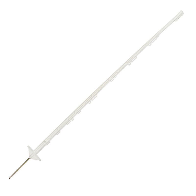 The stake with a height of 140cm in white was designed for the construction of electric fences. Ideal for larger animals, such as horses or cattle, which require a fence higher than standard. This stake height prevents large animals from getting out of the fence. The electric fence post is light and easy to install, so it is ideal for portable and temporary fences. The fencing's stake is made of high quality material based on polypropylene. Thanks to this, it is resistant to adverse weather conditions, including UV radiation or temperature changes. Its structure has been strengthened by ribbing, and the addition of a steel tip with a length of about 20cm significantly increases the solidity of the structure. Thanks to this, the stake is stable and does not bend. Polypropylene post has a special leg that facilitates permanent digging, regardless of the hardness of the ground. At different stake heights there are many fasteners used to hook all kinds of PolyPolytapes, wires, or Polywires, necessary to create an electric fencing. This makes it possible to adjust the electric fence to specific animals of different dimensions.The stake of the electric fence is sold by pieces. The price given is for 1 piece of the bar.