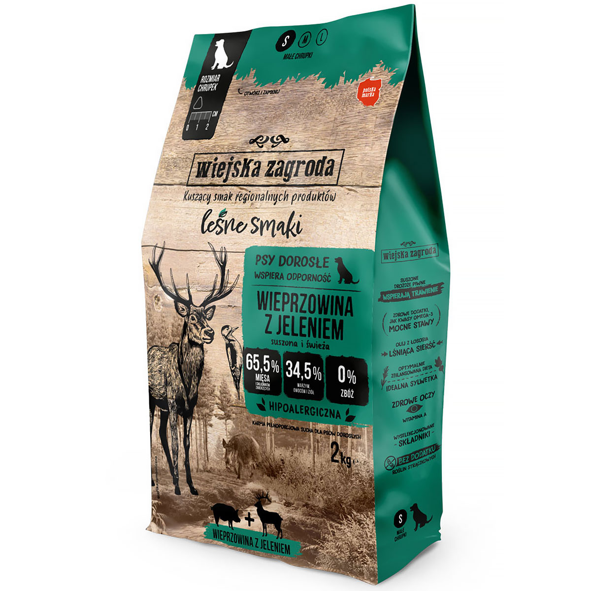 WIEJSKA ZAGRODA LEŚNE SMAKI WIEPRZOWINA Z JELENIEM to sucha karma dla psów o rozmiarze chrupek S - polecana szczególnie dla mniejszych psów. Niezwykle smaczne połączenie wieprzowiny z jeleniem, któremu nie oprze się żaden pies. Hipoalergiczna karma została przygotowana przez dietetyka ze składników o jakości do spożycia przez ludzi, pochodzących od lokalnych dostawców.