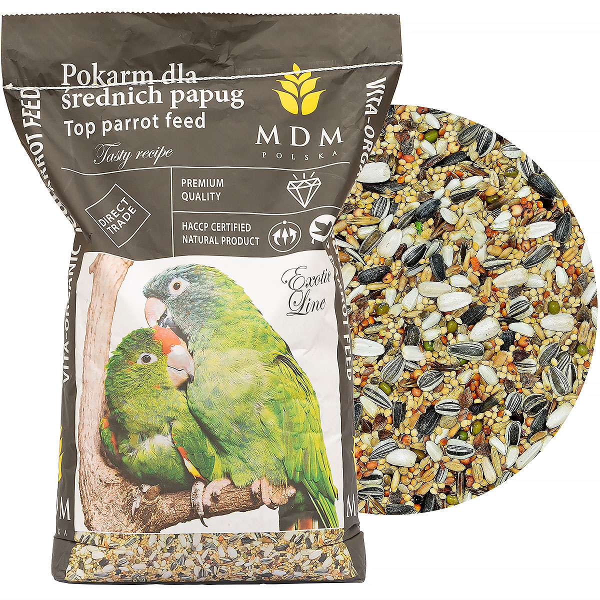 Vita-Organic food for medium-sized parrots in a 10 kg package from MDM is a mixture of selected, high-quality grains used in the feeding of medium-sized parrots. Complete food will meet all the nutritional needs of medium-sized parrots (Alexandretta, Royal Parrot, Redtail, Conure and many others).
