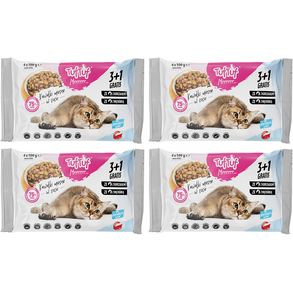 TUF Wet Food Chicken Sachets Liver 40 x 100 g is a perfect combination of 40 sachets, 20 of which contain the intense flavor of chicken and the other 20, tender liver. This wet cat food set offers a comprehensive experience of culinary richness, providing not only tasty pleasures, but also wholesome nutrients. In each of the 10 packs, you will find 2 sachets of chicken and 2 of the liver, creating a balanced set that will satisfy the cat's palate and provide the necessary nutrients at the same time.