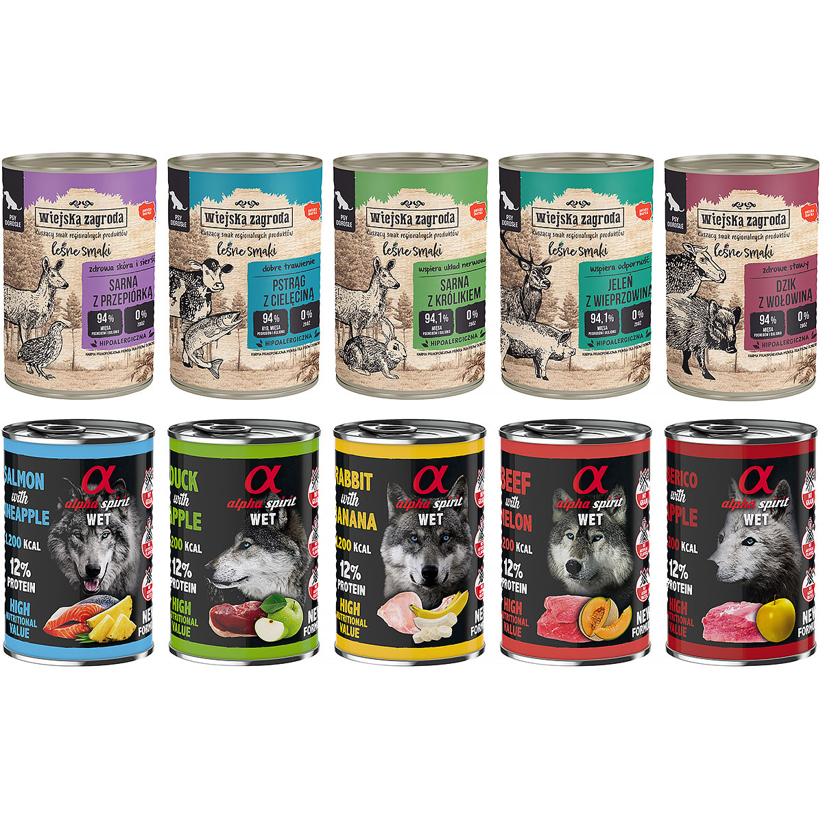 Wet dog food Wiejska Zagroda Forest flavours Alpha Spirit mix 10 x 400 g is an excellent, balanced and wholesome set that combines two different types of Alpha Spirit food. Wiejska Zagroda foods are a guarantee of the highest quality ingredients that provide many nutrients, vitamins and minerals from regional sources of forest animal meat with the addition of farm animal meat. In addition, Alpha Spirit foods, enclosed in airtight and convenient cans, are original flavor combinations that guarantee your four-legged friend a taste experience. Meals filled with healthy and wholesome meat with the addition of aromatic fruit will make your pet irresistible and fall in love with the food from the first bite.