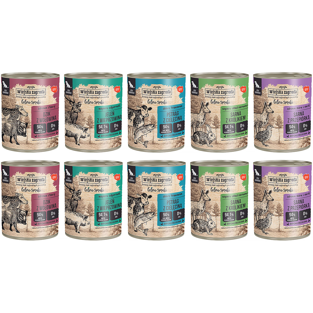 Wet dog food Wiejska Zagroda Forest Flavors mix of flavors set 10 x 800 g is a unique proposition for all dog owners who want to provide their pets not only with a unique taste, but also with wholesome and healthy food. This set is a great opportunity to diversify your pet's daily diet, providing him with a variety of flavors and valuable nutrients.